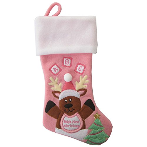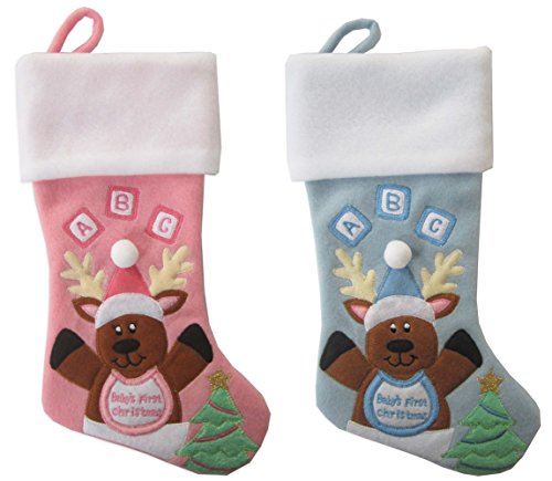 Baby's First Christmas Stocking, - AB • Baby's First Christmas embroidery on bib • Building blocks with ABC embroidery • American designed; fleece material • 13 inch approximate diagonal hanging length excluding loop • Plain white cuff allows for DIY personalization - Make your baby's first Christmas a memorable one with a unique Baby's First Christmas stocking. Our American designer was sure to include the essentials - ABC, bib and diaper components that will warm your heart. This stocking is made from fleece with felt applique. This stocking will be cherished for years to come. Give as a present for one expecting or for your little new bundle of love.