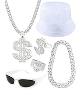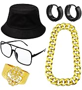 This 4-piece 80s/90s hip hop costume set by Riuziyi features a 32-inch gold-tone plastic chain, a gold-plated alloy dollar sign ring with rhinestones, and durable twist-leg punk sunglasses. Designed for men and women, it offers a high-polish, skin-friendly finish ideal for parties, festivals, and themed events, delivering authentic retro style with lasting quality.