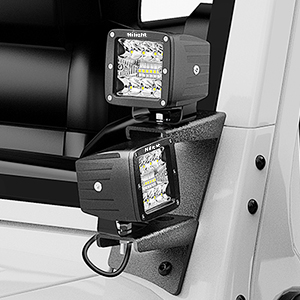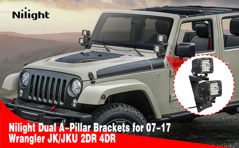 Nilight’s 2PCS Dual A-Pillar Windshield Mounting Brackets are precision laser-cut, paint-safe mounts designed specifically for 2007-2017 Wrangler JK/JKU models. They enable mounting of two LED or HID lights per A-pillar, enhancing off-road visibility and vehicle aesthetics, backed by a 2-year warranty.