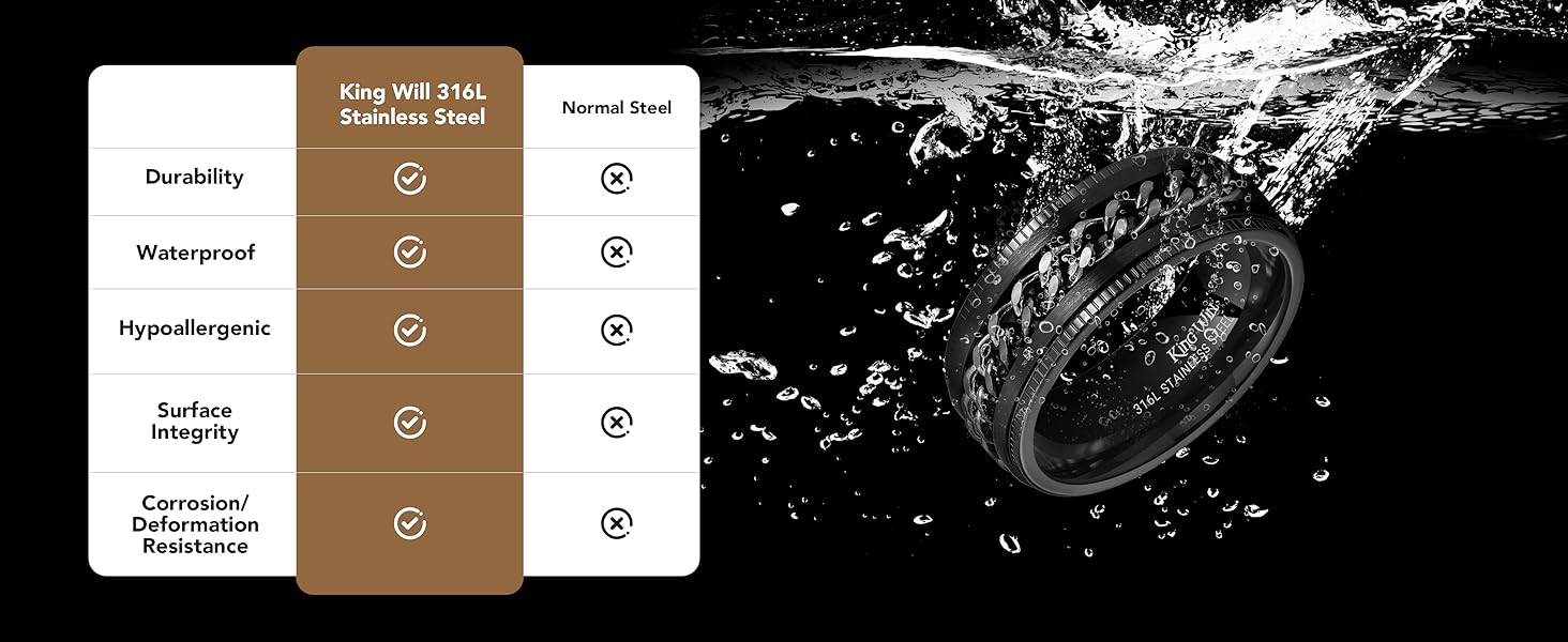 King Will Trustworthy Brand King Will, not only an trustworthy brand of wedding rings, but also means the vow keeper. "I will take you to be my wife; to have and to hold from this day forward, for better, for worse, for richer, for poorer, in sickness and in health, to love and to cherish, so long as we both shall live. All this I vow and promise."King Will, the vow keeper Product Return&Transport Since customization is most unique, it is non-refundable once factory production begins.Since each custom ring is made by workers from abroad, it will arrive in your hands within the next 30-45 days. Stainless Steel Ring Maintenance Tips 1.Stainless steel ring cleaning: Pour some warm water in a small bowl, and add some mild dish-washing soap. Dip a soft, lint-free cloth in the soapy water, and then gently wipe the stainless steel jewelry with the damp cloth until the piece is clean. Wipe the remaining soap off your jewelry using a moist cloth dipped in clean water. Dry the jewelry well with a clean towel, and then leave your pieces to air dry. 2.Stainless Steel Ring Care Tips: Store your stainless steel pieces separately from jewelry made of other metals. It is best if you keep your stainless steel items in individual bags or pouches. Although stainless steel jewelry doesn't tarnish or corrode and doesn't require special care, it can scratch. That's why you should wear and store your pieces in a way that minimizes any contact with other items that can damage your stainless steel jewelry. About the size measure Measure your finger size before purchase, for stainless steel ring cannot be resized. The paper measurement is intended for reference only. We would like to suggest you have your finger sized at a jewelry store for an accurate ring size.