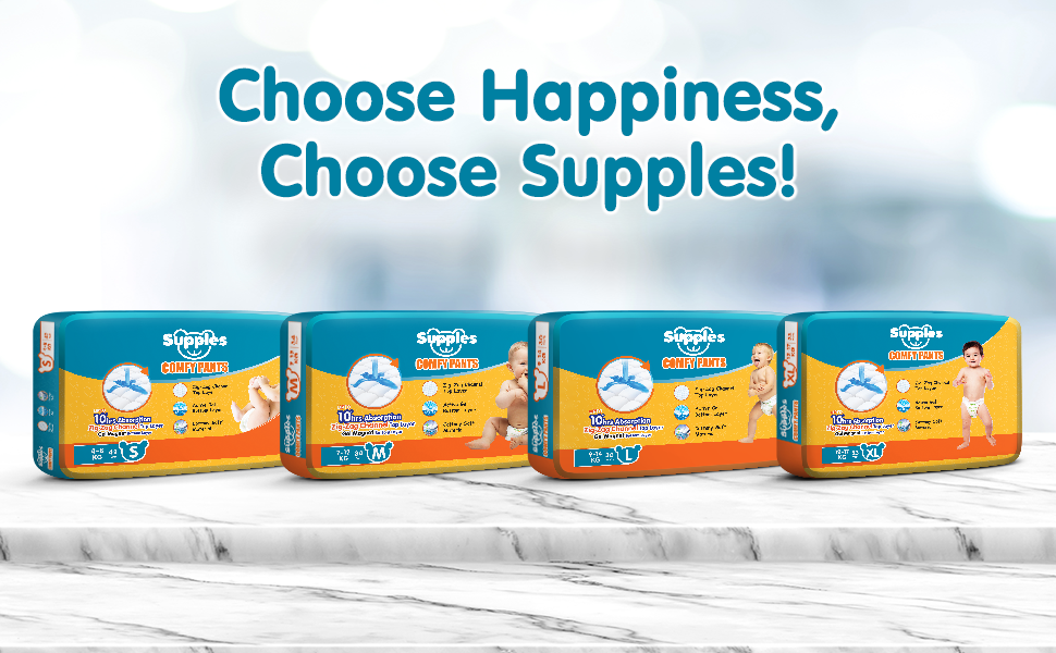 The Amazon Brand - Supples Comfy Diapers in Large size (30 Count) are designed for babies weighing 9-14 kg. With a remarkable 10 hours of absorption and made from soft, breathable, alcohol-free materials, these diaper pants ensure your baby's comfort and dryness. The innovative design features a Zig-Zag channel for optimal liquid distribution, making diaper changes quick and easy for parents.