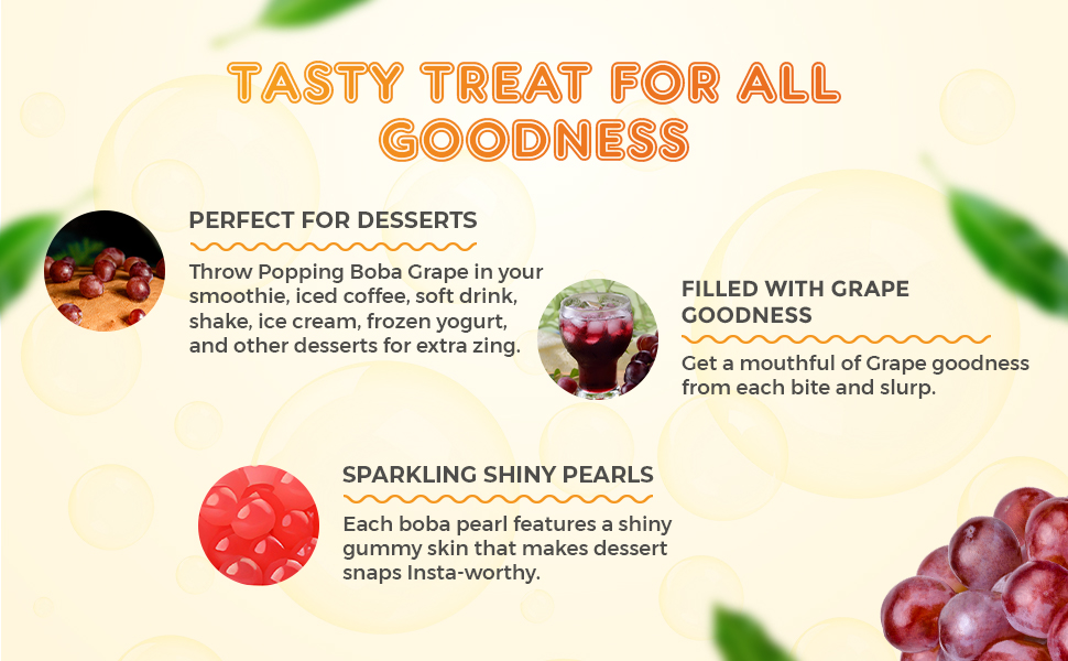 - 𝐄𝐧𝐫𝐢𝐜𝐡𝐞𝐝 𝐖𝐢𝐭𝐡 𝐉𝐮𝐢𝐜𝐲 𝐆𝐨𝐨𝐝𝐧𝐞𝐬𝐬: The fruit boba pearls are filled with natural and organic Grape goodness. You get a juicy, mouthful taste of Grape with every bite and slurp of your favorite beverages.