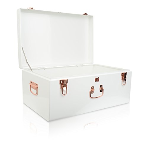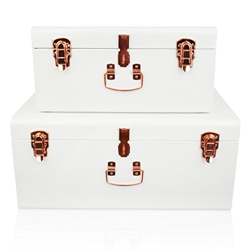 This set of vintage style metal nesting trunks are elegant in design and make a warm addition to any room. The White painted trunks are finished with rose gold fixtures. These trunks are ideal for blankets, books or even as a stylish toy box for children. This set comes with 2 metal trunks measuring small: 44x27x21cm and Large: 56x35x25cm.