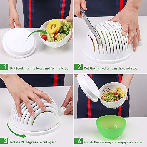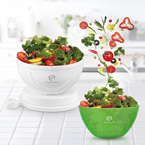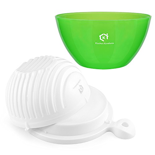 For those looking for a healthy diet, there is no better place to start with a fresh, nutritious, and balanced salad. To prepare a salad at home, however, can be time-consuming. You have to wash, rinse, slice and then chop all the fruit and vegetables. What's more, at the end your cutting board will be a mess. Kitchen Komforts Salad Cutter Bowl can keep all the ingredients together and has slots for a knife. Cross cut a variety of fruit and vegetables to satisfy your hunger at home in just 60 seconds. Made of Premium Material This salad cutter bowl is made of safe, non-toxic, and food-grade PP material. It is certified to meet FDA and LFGB safety standards. The unique material withstands temperatures from -10 °C to 70 °C and won't break or deform over time. Convenient to Use and Clean Use the cutter bowl as a strainer and the base as a cutting board for a perfect cross cut along the slots. You can also turn the strainer to slice the fruit or vegetables even smaller. You don't have to worry about cutting your fingers, making it safe for beginners. After you've used the cutter, the smooth surface can be easily rinsed without leaving any oil or food residue. Operating Instructions 1.Put all your fruit and vegetables into the cutter bowl and wash them. 2.Place the base on the bowl. Make sure the base firmly clicks into the slots on the bowl. 3.Holding the base securely, turn the bowl upside down. Use a knife to cut along the slots of the cutter bowl. 4.Rotate the bowl 90 degrees and slice again for smaller pieces. 5.Holding the cutter bowl securely, turn the bowl over once more before removing the base. 6.Mix your ingredients and dressings together and enjoy your very own homemade salad. Packaging Contents 1 x Cutter bowl with base ( 22.5 cm x 18 cm x 10 cm) 1 x Salad bowl (17.9 cm x 9.3 cm)