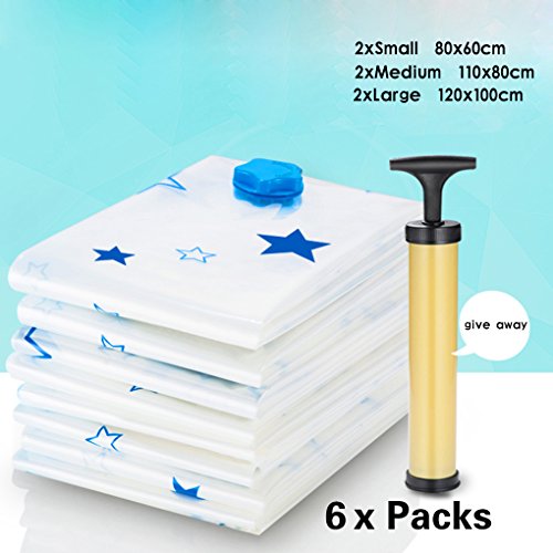 High Quality and New Brand.Saving space: space saver bags, the storage space in your home can be used wildly .Jumbo bags allow you to place the volume of one piece of about 8 kilogram cotton quilt. The volume can be reduced by up to 75% depend on what items placed in the bag.Protection for clothes and bed: Place the clothes, bedding in the vacuum storage bags not only can save space, but also can protect against water, dirt, mildew, insects, odors and so on.Good tightness:Using the storage bags, every bit of air can be out of the bag due to its perfect characteristics, unique double-zip seal and the valve design.Reusability and High quality:Vacuum storage bags are with high quality, it can be reused for many times. Just open the seal and remove the items out, then it can be reused again to hold more items.Make your life easy: Simple to use and compatible with any vacuum cleaner.Longer lasting vacuum: double zip seal and triple seal turbo valve to minimise air leakage for long term storage; every aspect of these bags is the highest quality.Packing:2 pcs for storage bags 2X 80X60cm Small Storage Bags1 X Free Hand Pump