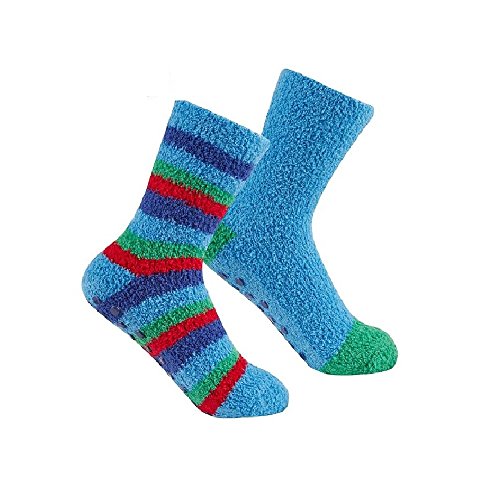 2 Pairs Boys Cosy Bed Slipper Socks Childrens Striped Nightwear (6.5-9 (infant), Blues)