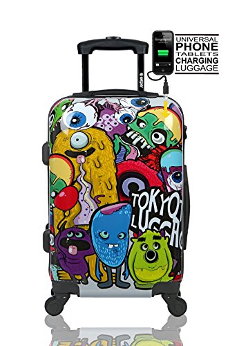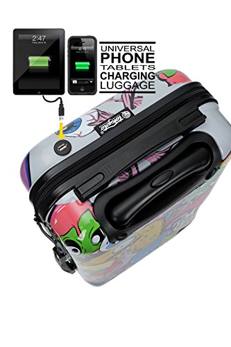 Suitcase prepared to charge mobiles. This suitcase is designed to put in it a mobile charger or tablet (if you don't have a charger, we will provide you with one). Don't run out of battery ever again! You will now be able to charge your mobile during your trip or while waiting in the boarding queue, during layovers, or while waiting for your taxi, etc. We have built in a charger in a small pocket inside the suitcase so you can plug the mobile to the suitcase when needed. And if you so wish, you can remove the charger from the suitcase and take it along with you during the day. You will never get to the Eiffel Tower with no batteries to take a picture, and your mobile will always be ready to make a phone call to your hotel or taxi when you arrive at your destination. The charger is sold separately so you just have to put it inside the suitcase. The charger comes with connectors for all smartphones (USB Connector, MicroUSB and Iphone) Notice: before purchasing our PowerBank check that your phone uses any of these 3 connections Accepted as carry-on luggage Ryanair accepted Size: 55x35x20 cm (50 excluding Wheels) 20″ x 7,88″ x 13,77″ (21,65″ including Wheels)Fixed TSA LockMaterials: Extremely robust, lightweight polycarbonate trolley case Top and side carry handleHighly resistant black tube handlePush button handle 360º multidirectional 4 wheel systemSingle strong zipper. Nylon lining + interior pockets + elastic belts Warranty: 2 years