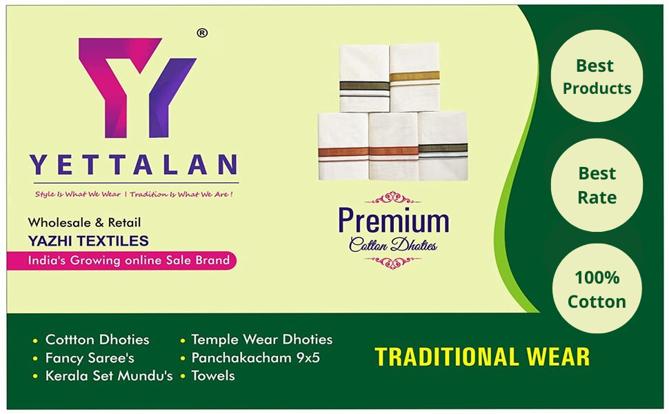 The Wide Range of Collections of Dhotis, Sarees and Kids Wear from House of Yettalan Brand Store on . The Dhoti is made with 100% Organic Cotton Yarns and Finished in Rudhraksa and Temple Design Borders. The Natural Fibers Make the Linen Soft and Cozy, Which is Used to Makes the Wearer Feel More Comfortable in All the Season Summer and Winter Season. The Length of the Dhoti is 2.00 Meters and Width is 1.28 Meters.This Rudraksha & Temple Designs Borders are Woven in Korvai Style. The Korvai Style Woven is Giving the Borders are Looking Very Thick and Bold. The Style of Woven Thick Borders Dhoties are Hand-Woven by Highly Skilled Weavers of Tamil Nadu. This Product is Available in Variety of Stunning Colors. The Rutraksha with Temple Design Border is Suitable for Pooja, Traditional Festivals, Marriage Ceremony, Temple Wear, Casual Wear, Celebrations, Gifting, Occasions, Lohri, Makar Sankranti, Baisakhi, Holi, Raksha Bandhan, Dussehra, Diwali, Navratri, Onam, Party, Weddings, Regular Wear, Ganesha and many Festivals Surprises. The Thalapathi Border Dhoti is also Popular as Vesti, Mundu and Panche. This Elegant Drape is Called as Kerala Traditional Mundu, Which has been in Use Since Time Immemorial. Yettalan is A Brand, Its Prime Focus on Perfect Attire for You and Your Family on Any Special Occasion and Festivals.