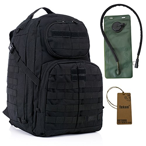 Tekon 40L Multipurpose Tactical BackPack Large Camping Hiking Shoulder Pack With 2.5 Liter Hydration Water Bladder System Features: High Strength 600D Oxford fabric. Adjustable capacity for the main pocket The main packet can hatch Water bladder. MOLLE system Velcro can stick flags or article name, etc Specifications: Material:Water-resistant 600D polyester fabric Backpack Capacity: 40L Water bladder capacity:2.5L Package including: 1 X 40L Multipurpose Tactical BackPack 1 X 2.5L Water bladder Nott: All of our bag has a promised guarantee period of 1-year.
