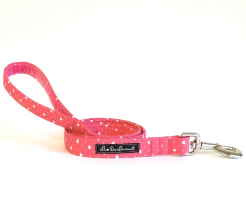 Pink hearts and polka dot fabric dog collar with webbing core for strength and lined with pink velvet for comfort. Collars can be washed at 30°, just hang on the line or radiator to dry. Clasps for 1 inch width collars are 1.5 inch and for ¾ inch width collars are just over an inch.