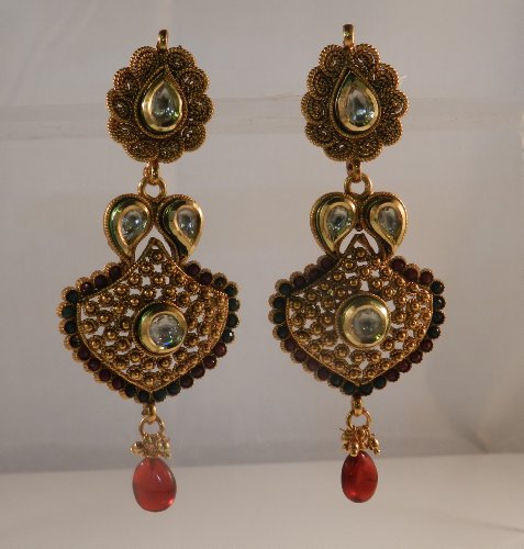 Earrings are the best accessories for a woman's face and whether it is for a grand occasion or just a casual outing you would find the suitable earrings.No outfit can be complete without a great pair of earrings. Most women can never think of stepping out without earrings. Choice of earrings depends on individual taste.If you like chic and funky stuff, then copper or silver hula hoops, or motif based earrings should be your pick. For those who always want to step out in style and create a style statement, there is a wide range of options at hand.Some of the popular picks include chandelier earrings, drops, hoops, and studs.These are chiefly dangling earrings that look heavy but are light on weight. To top this, we use non-allergic metals so as to avoid occurrence of rashes on sensitive skin.These earrings are extremely traditional with antique mango motifs and beautiful Indian designs. These go well with traditional Indian wear like lehengas, sarees, and salwar kameez. These earrings have a copper base with antique gold finish. The earring stud has a tear drop shaped kundan which is bordered by beautiful spiral gold motif. Right below are two kundan stones set on a mango motif. The big dangling following the kundan stones are adorned with small green and red stones outside a beautiful round kundan stone and gold plated spherical motifs. These earrings have a gold hoop on top which can help connect it to a Sahaara. A Sahaara is a chain going from the front of the earring over the ear & either: hooked directly into the hair; or around the back of the ear. It can be affixed using loops which you feed onto the earring post.