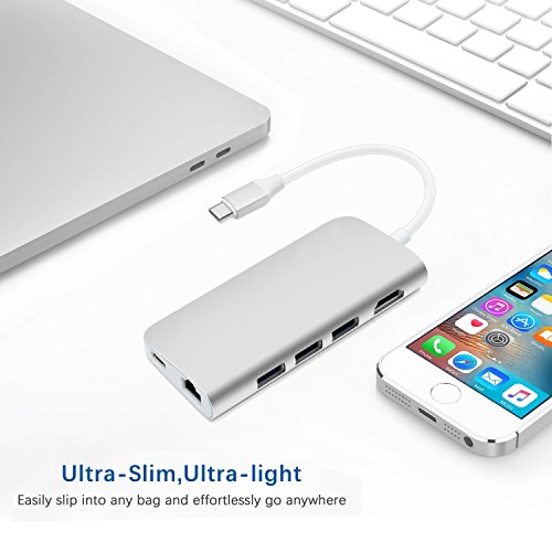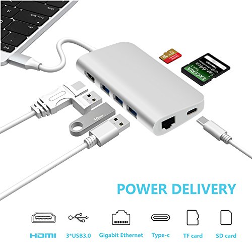 Product Features: 1.More Ports, More Convenience - features three USB 3.0 ports, SD and Micro SD card slots, Ethernet, charging port, and 4K HDMI video output. 2.Fast Speed Data Transmission-- USB version 3.0, offers data transmission speed up to 5 Gbps, you can transfer everything from a 2TB SD card to your MacBook in just a few seconds. 3.HDMI 4k Video Display - Use the HDMI port to output crisp, high-resolution video to your 4k monitor screens. Simply, connect an HDMI cable from the Pro Hub Adapter to your external monitor to view crystal-clear display. Specifications: * Supports USB3.1 USB-C (Type-C 1.0 Spec) * Supports PD charging via USB-C * Supports 3xUSB 3.0 Hub * Supports Internet 1000M LAN * Supports SD and micro SD (UHS-I) to use at the same time * LED indicate for working status Full compatible with these devices(Both Data Transfer And Charging) 1)Macbook 2015/Macbook 2016,Macbook Pro 13''/15''2016 2) Google, Chromebook 2016,HP Spectre Notebook 2016 13" 3)Microsoft Lumia 950/950XL 4)Hua Wei Matebook 2016 !!!An extra 60W power plug needed for power delivery to work 5)Dell XPS 13/15 An extra 60W power plug needed for power delivery to work 6)Xiaomi Air 2016 12.5" Data Transfer Works But CANNOT pass power to these devices: Asus ZenBook3/Transformer3 Pro,Samsung TabPro S,Wacom mobilestudio pro 16,Nexus 6P