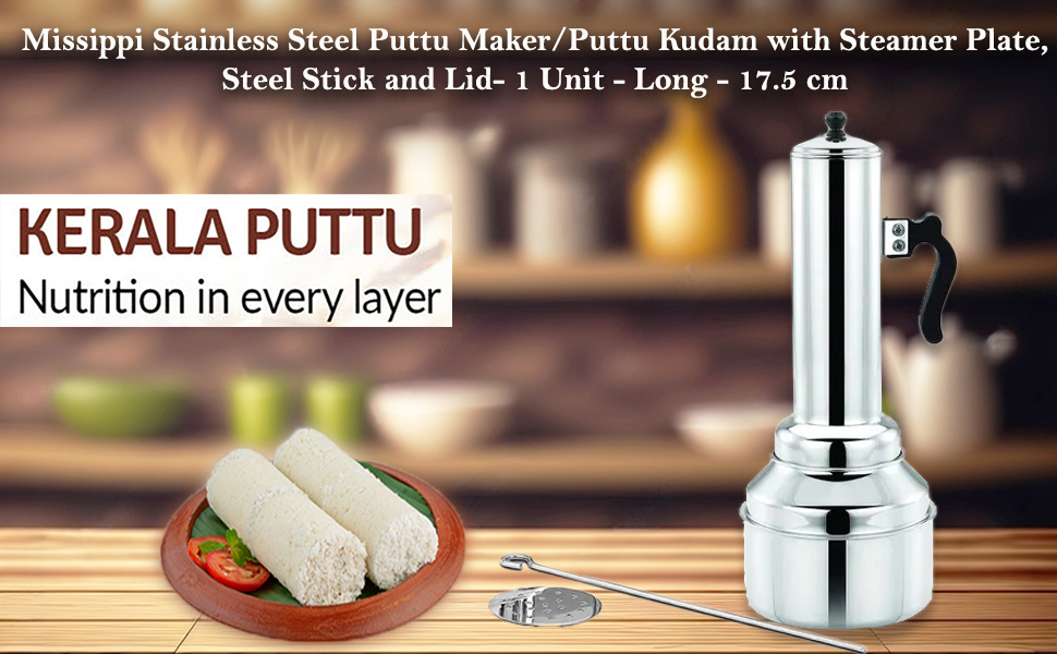 The Missippi Stainless Steel Puttu Maker is a 17.5 cm long, polished, food-grade stainless steel kitchen essential designed for durability and efficiency. Compatible with gas and induction stoves, it features heat-resistant bakelite handles and comes complete with a steamer plate, steel stick, and lid. Ideal for preparing a wide range of traditional puttu varieties, it offers a fuel-efficient, rust-proof solution for authentic South Indian steaming.