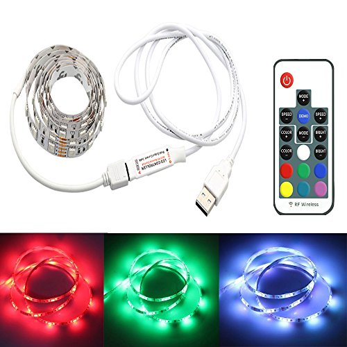 Specification LED quantity: 60pcs LED type: RGB SMD 5050 LED LED strip length: 78 inches USB Cable length: 39 inches Output voltage: 5V Color:White Easy Installation: 1. The length of the strip is is 78 inches(2 meter), if needed, you can cut it through the cut marks(gold line) into your desired length with scissors. 2. Make sure the installation surface must be smooth.clean and dry. 3. Remove the adhesive backing on the strips,Attach and firmly press the strips to the back of your TV or other desired places, then Connect with LED controller USB cable,and plug in USB port or any other DC 5V power supply. Mode: 60 pcs super bright RGB 5050 LED, can display 20 different colors, 22 dynamicmodes, 5 brightness levels and 10 speed levels,personalized your space with vibrant LEDs, and bring you with colorful, comfortable and relaxed atmosphere. Application: USB RGB LED TV Backlight with 20 different colors and 22 dynamic modes make your home like theatre, which you can easily customized your desired bias light add on your TV and Desktop PC,Under Kitchen Cabinet,Bookshelf. Any other places you need accent light! Package Includes 1 x 78 inches(2M) LED TV Backlight Strip 1 x 39 inches(1M) LED Controller USB Cable 1 x 17 Key RF Wireless Remote Control 1 x User Manual