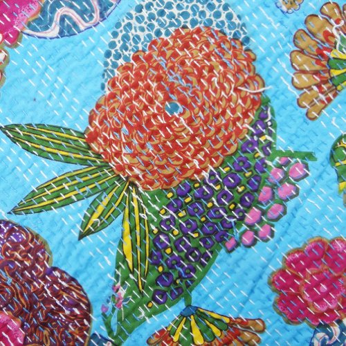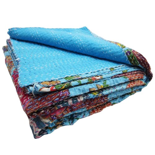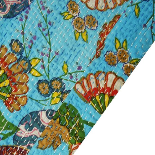 The entire quilt is painstakingly embroidered with thousands of small and delicate kantha stitches to create a one of a kind masterpiece! It is made from vintage old cotton saris, and softly quilted . It is embroidered by artisans in countryside. Kantha is the ancient Indian art of embroidery, actually the kantha is a simple running stitch. The way in which the stitch has been used is what makes the quilt extraordinary. While making the PIECES, the cloth is given layers that are kept together by the stitches. It is made is such a way that it is REVERSIBLE, can be used from both sides. As this is made from vintage sarees, it has some imperfections. They have patches of other color clothes. they might have some stains, although we wash them well before shipping to remove bad odor and spots. All these imperfections make these vintage art pieces more unique, charming & perfect piece for your home. We hope u would love this art.
