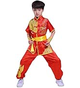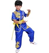 This Boys & Girls Kung Fu Master Tai Chi Dragon Uniform is a 5-piece set featuring a top, pants, wrist cuffs, and belt made from soft satin fabric. It boasts an eye-catching embroidered dragon with gold shimmer trimmings, fits regular USA sizes for kids and adults, and combines authentic martial arts style with everyday comfort.