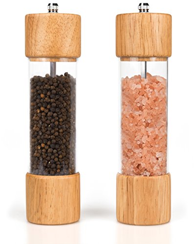 Salt or Pepper Grinder MumoHome - Elegant Design with Adjustable Fineness Ceramic Grinder for Spices - Pepper Mill Acrylic Body and Wood (2ps) • High quality grinder: built in transparent acrylic plastic and high quality wood; classic and elegant design guarantees great functionality and aesthetics • Simple and smart: the big capacity of the spice jar allows long terms use between every refill • Built to last: the lower ceramic grinder allows easy, precise and reliable grinding for years • Easy to use: easy to clean, simple opening ang closing mechanism allows easy refill • Safe: non-toxic materials guarantee safe and clean operationThe Wooden Salt and Pepper Grinder MumoHome is built with high grade materials in order to preserve the aroma of your favourite spices. The simple and minimal design guarantees a good match with the interior design of your kitchen and your living room. The big acrylic jar allows protection from impacts and high transparency, so you can appreciate the natural colour of your spices. Product Description Material: Wood, Acrylic How to use it: 1) Unscrew the upper metal bolt to open the jar, then fill it with your favourite spices and close. 2) Once closed rotate the upper wooden part to adjust the grind fineness: rotate clockwise for finer grind, counter clockwise for coarser grind. MumoHome The quality of life matters, so does what we use every day. MumoHome believes that every single object we use should mean something more than its purpose. What we provide were selected with heart, so that quality and happiness is always your first impression. Also, your experience throughout the shopping process is fully considered and covered by MumoHome warranty policy. All you need to do is sit back, and enjoy.