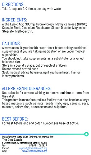 Alpha Lipoic Acid is one of the ultimate anti-wrinkle, anti-ageing, anti-inflammatory 'fountain of youth' supplements. Alpha Lipoic Acid helps prevent and reverse the following health disorders: Obesity; insomnia; high blood sugar; chronic fatigue and fibromyalgia; acne; irritable bowel syndrome; grey, wrinkled, dry skin; joint/tendon inflexibility, immobility, damage and weakness; arthritis, autoimmune disease, polycystic ovary syndrome, infertility,obsessive compulsive disorder, depression, schizophrenia, dementia and Alzheimer's disease, inflammatory bowel disease, stroke, cardiovascular disease, tooth cavities, liver disease, acid reflux, ulcers, certain types of cancer, migraines and any of the endless number of disorders which are known to be the result of failing energy homeostasis in the body. *The purchase of any Diet Coach product comes with the option of free online diet support and advice. This is because the optimisation of health and body composition requires a two-pronged approach of dietary strategy combined with dietary supplementation. If you would like to take up this offer of free diet support, simply reply with your confirmation to the email which is sent out automatically following the purchase of any Diet Coach product.