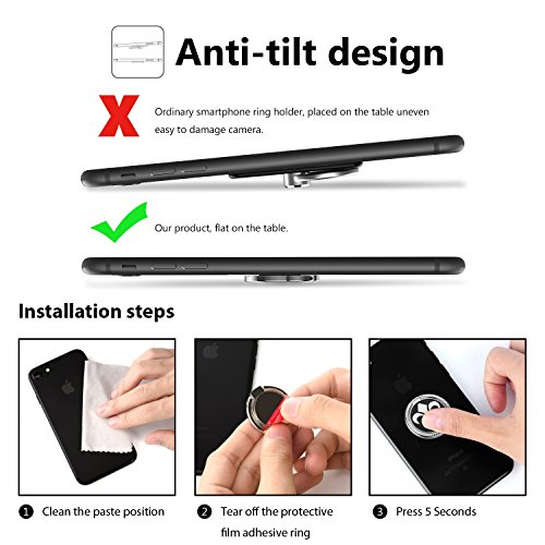 Usage Method 1. Wipe away dirt, dust etc. on the back of your phone, dry it completely. 2. Peel off the protective paper. Do not touch the adhesive surface. 3. Press the ring holder against 15 seconds. 4. After 24 hours hanging heavy, the effect is much better. The Second Protection For Phone: Phone grip to prevent dropping device and control device while you are operating the phone and taking a picture. Good for watching the movie and playing music. Easy life: Cell phone holder can prevent the user's devices from dropping while they are operating them, such as reading the news, checking messages and taking selfies. Please Note: 1. Please choose the best position before putting it on. 2. Please remove immediately and stick to the right position if put in the wrong position. 3. It does not work well with some phone cases such as: 1)the phone case that sprayed rubber oil on the surface 2)matte phone case 3)phone case with uneven surface What you get: 1* Phone Ring Holder
