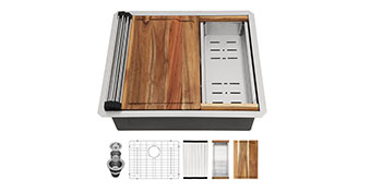 | Included Components | 1 pc wood cutting board, 1 pc stainless steel bottom grid, 1 pc drainer assembly, 1 pc colander, 1 pc roll-up drying rack |