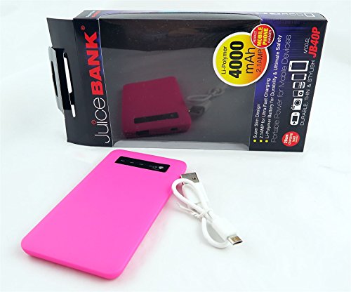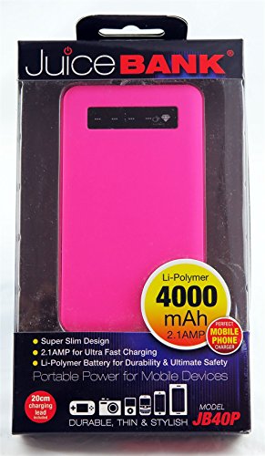 Juice bank (JB40P) is a powerful and super slim charger, 2.1 AMP for ultra fast charging. The juice bank charger can be taken anywhere, its perfect for recharging your smartphones , tablets, cameras , GPS, games sysytems and more. Great safety features including over charge or discharge, maximum at all times. It has also tempreture protection monitors battery temperature to avoid overheating and damage to the battery itself and power bank. Do Not Let Young Children Use Juice Bank Unless Under Adult Supervision.