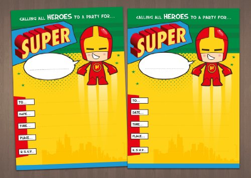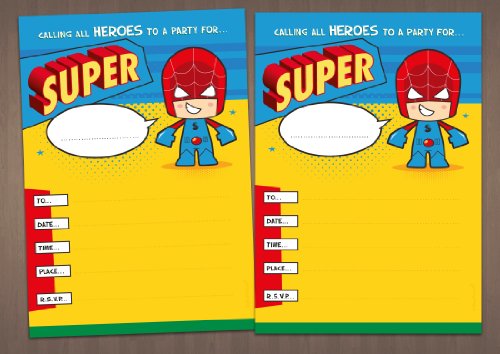 Pack includes 20 x Superhero invites. Includes 4 invites x 5 characters/children dressed as their favourite hero costumes. A5 size birthday invitations and 20 x A6 envelopes envelopes. Blank space is provided for you write child's name.