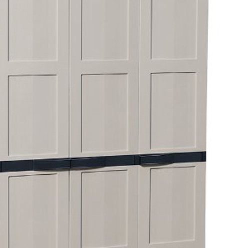 Product description: 3 door cabinet with 4 adjustable height shelves and a space for tools. Resistant to low temperatures, for indoor and outdoor use. Maximum weight per shelf 20 kg Lockable doors. Assembly time: 20 min. no tools. Dimensions in cm: 97 x 37 x 165 h.