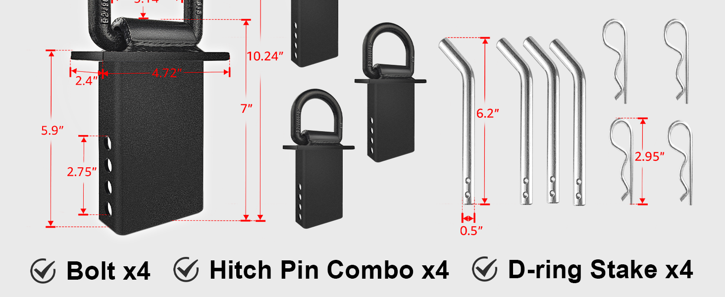 The VIAGL 4-piece D-Ring Stake Pocket Tie Down set transforms your truck or trailer's stock pile pockets into heavy-duty anchor points with a 16,200 lbs breaking limit and 5,400 lbs working load. Crafted from solid steel with a corrosion-resistant powder black finish, these removable D-rings feature quick-install hook pins for fast repositioning and compatibility with various hooks and straps, ensuring maximum versatility and durability for demanding utility and flatbed hauling.
