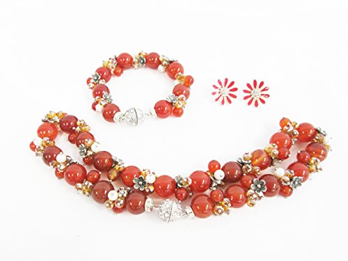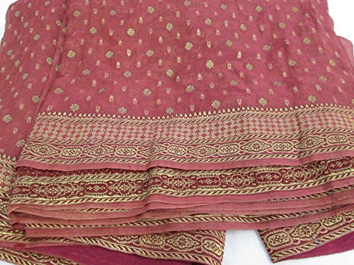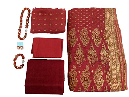 Rich hand woven chiffon with an updated traditional pattern. This soft and fabric is woven with gold zari flower motifs all over and gold zari flower and geometric design border and pallu. Matching hand loom Blouse fabric woven with flower motifs all over. Matching lining fabric Adjustable size petticoat. Includes a beautiful stone and bead French design burnt orange necklace and bracelet and pink flower fashion earrings. These are beautiful pieces that may be worn with any outfit.