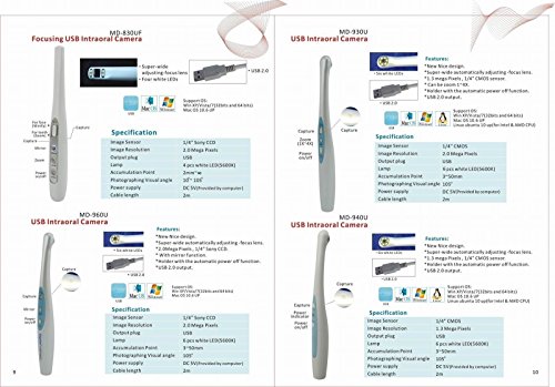 USB dental cameras Specification: Image sensor: 1/4" CMOS Image resolution:640480 pixels Lamp: 6pcs White LED (5600K) visual angle: 105 degree Power supply: DC5V cable length: 2.5m