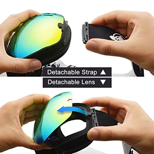 Material Lenses: Italy imported Polycarbonate. Fully UV protection. Drop Ball Test Compliant. Frame: Soft rubber TPU Design Embeddable Myopic Lens Double-Lens Anti-Ultraviolet radiation Anti-Impact Anti-Fog Dual-Clip Breathable Form Design Three layers of Form Colorful Lens Feature Frameless design, ultra wide angle spherical lens Dual layer foam with a third layer of soft fleece for ultimate comfort. Detachable /replaceable strap allows you for easy premium strap upgrades. Simply use rotating clips for quick and easy lens swapping. Function Prevent cold stimulation of the eyes Can block the strong winds, snow grains and a variety of light to prevent UV on the eye burns No metal accessories, protective and safer Adjustable elastic band, suitable for a variety of face needs, more humane Skiing, hiking, snowboarding, motorcycle wind protection and other outdoor sports use, wind, anti-UV, anti-dust. Package includes 1 x Skiing Eyewear 1 x Eyewear cloth Notices Please do not touch the glass directly as the glass surface may get stained. Please do not use cosmetics when wearing the goggle e.g. mascara and lipstick in order to avoid smudging the glass. Goggle has good toughness but please do not bend it too much time as it may create scratch on the frame. Please leave the goggle at ventilate place to dispel the sweat. Please do not scrub the goggle frequently as it may affect the performance of anti-fog film especially the inner glass. Choose a pouch or glass box to prevent incident.