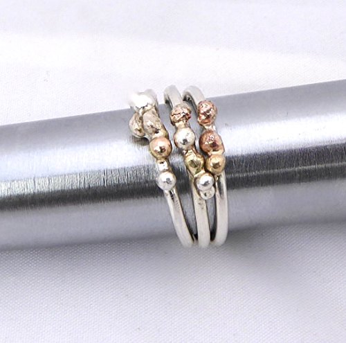 These stacking rings are made of solid sterling silver and the bobbles are hand formed from 24k recycled rose and yellow gold and solid silver. The little bobbles are made by a technique called granulation it has been used since ancient times to decorate fine gold and silver jewellery. First I make the rings then the bobbles and lastly I add the bobbles to the rings one by one in a freeform organic style. Stylish, simple and modern set of 3 stacking rings....easy to wear with everything Pictures have been deliberately taken in close-up to show details and do not indicate the size or scale. Please take time to read the detailed listing description and use a ruler if necessary.
