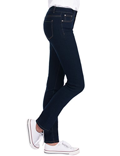 These ladies jeans are a classic mid rise jeans model. The dark blue stretch ladies jeans are in five pocket style and have a zipper. The women's trousers are made of 50% cotton, 47% polyester and 5% elastane. Due to the elastane content these trousers have a good fit as well as a high wearing comfort. The total length of these jeans is 94cm, the inside leg length 71cm, rise 23cm, thigh 22cm and bottom leg width 15cm. (All data measured at size S/8).