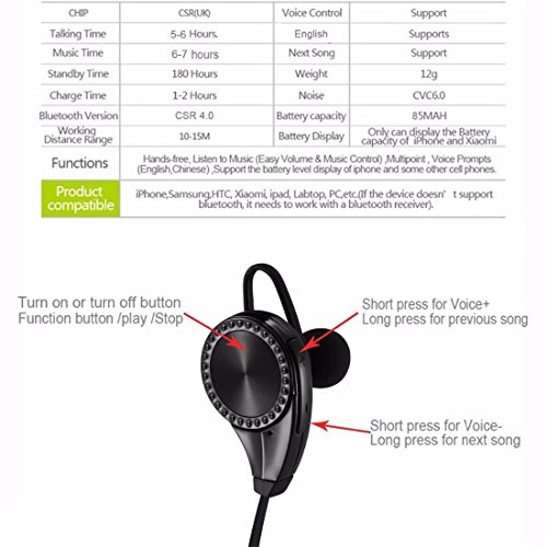 Function: Bluetooth,Noise Cancelling,Microphone,for Video Game,For Routine Office Work,Wireless Headphone,For Mobile Phone,Portable,For iPod,Sport,Supports musicStyle: Behind-ear sport headset Running jogging headResistance: 16?Wireless Type: BluetoothPlug Type: WirelessSensitivity: 121±3dBConnectors: USBIs wireless: YesWith Microphone: YesSupport Apt-x: NoVocalism Principle: Balanced ArmatureFrequency Response Range: 20-20000HzSupport Memory Card: NoWireless Technology: Bluetooth 4.0Voice prompt: Chinese/EnglishMicrophone: Built-inEarpiece Design: EarbudCompatible Model: Portable media playerWireless Range: 10mFeatures: Noise CancellingChip: CRSBluetooth Profiles: A2DP, AVRCP, HSP, HFP, APTX Noise reduction: CVC6.0 Battery: 80mAh Charging Time: about 2 hours Talking Time: 5 hours Standby time: about 175 hours