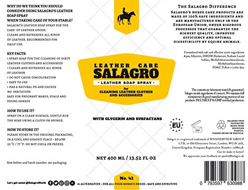 Key facts about Salagro's horse care products: • Carefully formulated and based on natural ingredients connected with modern technologies. Safe for your horses and effective. Salagro offers only the highest quality products for the most demanding customers and their horses • Made of premium ingredients in the European Union • ISO, HACCP and GMP certified production. Salagro's horse care products are manufactured in accordance with the highest quality guidelines and human grade standards • Salagro guarantees it is 100% doping free How to use it? Spray on a clean surface, gently rub the soap using a cloth or sponge. Available packaging: 400 ml / 13.52 fl oz plastic spray bottle. NOTE: Salagro uses packaging made from recycled plastic. Please reuse or recycle. Formulated with safe and effective active ingredients: Aqua, Glycerin, DMDM Hydantoin, Sodium Lauryl Sulfate, Methylchloroisothiazolinone, Methylisothiazolinone, FD&C Yellow 5 (color dye). The contents are laboratory tested and guaranteed. Salagro avoids ingredients of concern. We maintain full transparency and good manufacturing practices of our products.