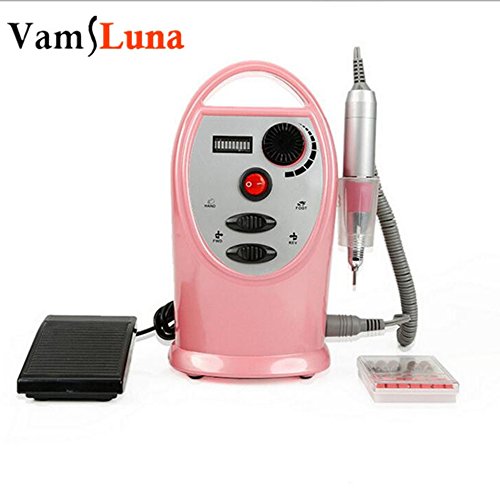 Specification: Rotation Up to 35,000 RPM Improved Overheat + Vibration Design, ideal use for studio and home DIY Rotation Speed: Up to 35000 RPM Power: 110-240V (It means it can be used volt ranging from 110V to 240V) Feature: Professional Full Electric Nail Drill Set -including drill machine, drill pen, pedal, stand, 6pcs bits, scrub rings and buffer block The nail art tools makes you enjoy for the nail art New design: Twist-lock design to ensure safe and easy installation. Mit Nail Drill Pen Slot that the drill pen can be good protected. Improved function: Double bufferung structure to ensure low variation and low noise. With forward and reverse function, you can operate it by Manual and foot pedal. Easy to handle and use. Package: 1 x Nail drill machine 1 x Drill Pen 1 x Foot Pedal 1 x cup 6 x Nail Drilling bits