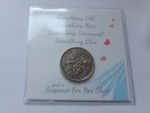 Details of the Sixpence gift : The sixpence is a circulated coin It will be a random dated sixpence The mount says: For the bride to be on one side with a wedding dress and hearts and the reverse says: Something Old Something New Something Borrowed Something Blue and a Sixpence for Her Shoe with a sixpence mounted below the wording this is placed in a plastic open sided sleeve which measures approximately 5.5cm x 5.5cm Details of the Garter: Elasticated light blue/ white lace trim with heart detail Maximum stretch 58cm The organza bag is embellished with plastic sequins