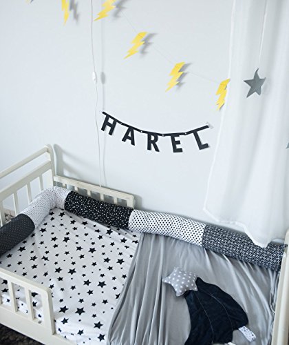 Baby "Snake" bed bumper, a soft & protective environment for your baby.This designed bed bumper is made out of 5 different high quality printed cotton fabrics, and colorful ribbons in both ends. Filled with a delicate hypoallergenic hollow-fiber.The bed bumper makes a beautiful and an extremely useful gift. Can be used as:★ Diapering area pillow.★ Crib, junior bed or toddler bed bumper for a soft & protective bed surrounding.★ Nursing pillow★ Develop motor skills - Strengthen baby's shoulder belt area.★ Developmental object - the ribbons in both bed bumper and stimulates the baby's sense of touch.★ accompanies the baby from birth to the late childhood as a bed decoration.*Available in 7 different color combination- Blue & Grey, Pink & Grey, Green & Grey, Purple & Grey, Beige & Grey, Black & White, Aqua & Grey.*This product is handmade sewn, using quality materials for a long lasting use of product.* Dimensions: Length - 78.7 (200cm)* Diameter -5.5 inch (13 cm).*Wash instructions: machine wash 30° -air dry, do not tumble dry.*Materials: High quality soft cotton fabric filled with hypoallergenic hollow fiber.*As this item is made to order, please allow 1 week for the item to be made prior to shipping.*Each item is beautifully wrapped to be given as a gift.*I would love to answer any question you have, please feel free to contact me.