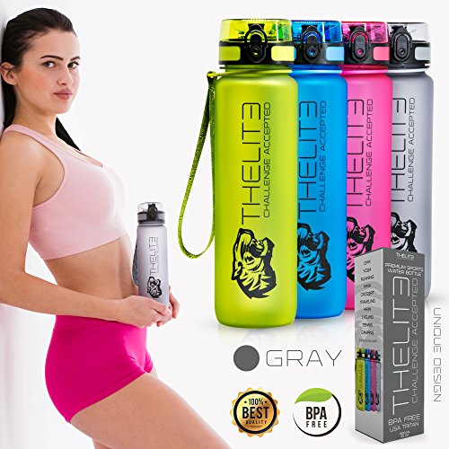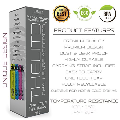 CHALLENGE ACCEPTED! STAY HYDRATED! ✔ PREMIUM SPORTS WATER BOTTLE - Stay Hydrated! Perfect for: - Gym - Fitness - Yoga - Running - MMA - Crossfit - Traveling - Hiking - Cycling - Tennis - Camping - Office - there is no limit! ✔ NON-TOXIC AND ECO-FRIENDLY MATERIALS - fully recyclable, suitable for hot & cold drinks - temperature resistance 14°F ~ 204°F - bottle is made from USA Tritan Co-polyester plastic that is SAFE to your body and environmentally friendly - it's Highly Durable material ✔ SPECIAL COLOR VARIATIONS with UNIQUE DESIGN - With unique design and neon color everybody loves the water bottle! Water Bottle is available in 4 different colors: - neon Pink, - neon Blue, - neon Green, - Gray 2 Size Variations: - 17oz - 32oz Full-color box is designed with careful attention to details! Different water bottle has different Color Box. STAY MOTIVATED in every moment you drink to water, challenge yourself to achieve new goals in your life! ✔ MULTI-FUNCTIONALITY and PRACTICALITY - Dust & Leak Proof - Special Lock System - Carrying Strap Included - Easy to Carry - ONE-TOUCH - Fast Water Flow System - Wide Mouth Opening ✔ 100% SATISFACTION GUARANTEED - in THELITE we believe that HAPPY CUSTOMER is our TOP PRIORITY and we would like to make sure that EVERY customer will be happy customer so we provide 100% MONEY BACK GUARANTEE! PERFECT GIFT -Looking for perfect gift? I bet this is THE MOST PERFECT GIFT for you and your friends!