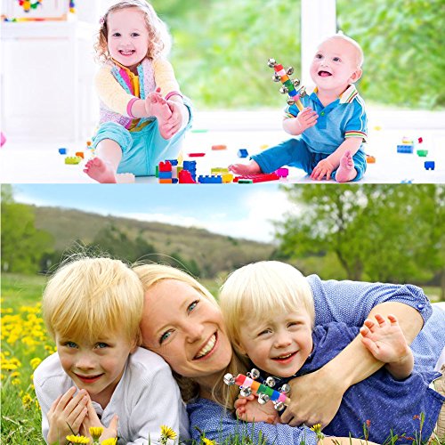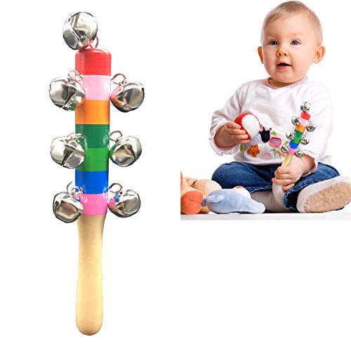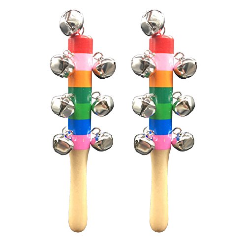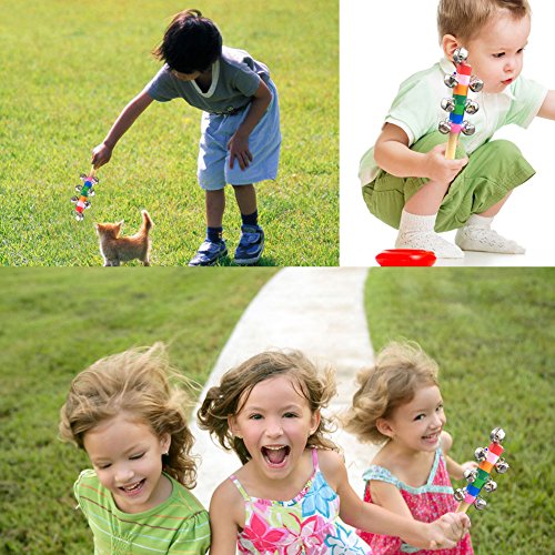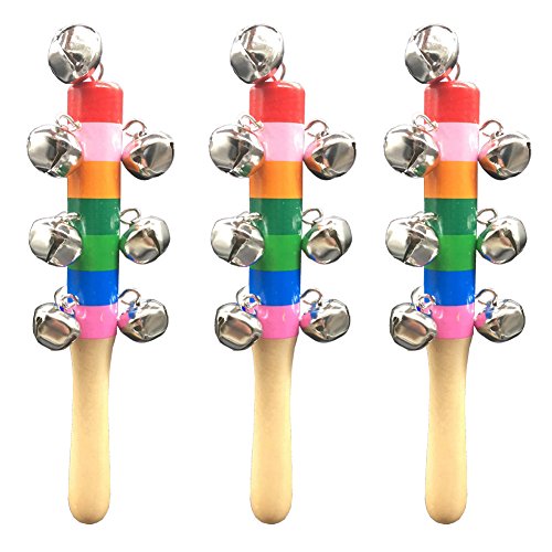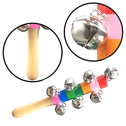 10 small cute bells with handmade wooden handle, gently shaking it will issue the crisp sound that is able to excite and delight babies together with rainbow colored paint on handle to help strengthen baby's sensory ability, hand-eye coordination and develop interest in music for early childhood education. wooden jingle hand bell is Made of high quality wooden material and non-toxic paint, safety for babies to play. Small sized smooth wooden handle makes it easy and comfortable to grip for babies. It's fun to use at home or on the go.We will be sure Children love them too. Weight: 49g/1.72oz each toy Stick Size: 17 x 2cm ( Length x Diameter approx. ) Bell Size: 1.5 x 1.5 x 1.5cm ( one bell approx. ) Colour:Rainbow color Package content: 3 * Rainbow Baby Kid Handbell Shake Rattle Toy