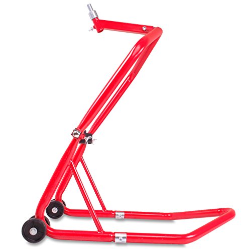 High quality heavy duty front motorcycle paddock stand.Folds out to enable the bike to be lifted by the front steering head tube.Designed to offer maximum access to the front end of the bike for all repair, cleaning and maintenance work.Simple strong and functional design.Supplied with 5 head lift pins to suit most makes & models.High quality fixed wheels for a smooth lift every time.Designed for maximum stability under load.Manufactured from robust tubular steel.Ideal for supporting most bike makes & models up to 340kg.Long, lasting and durable construction for a long service life.Supplied complete as shown.Please note colours may vary subject to availability.Kit Includes:1 x Front paddock stand1 x 13mm head lift pin1 x 15mm head lift pin1 x 16.5mm head lift pin1 x 17mm head lift pin1 x 18mm head lift pinMaximum headstock pin height - 34"Product Specifications:Maximum weight capacity: 340kg / 750lbProduct weight: 30kg