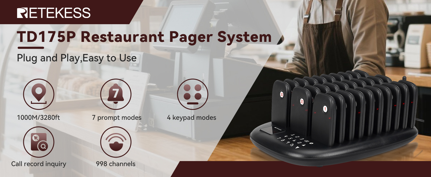 The Retekess TD175P Restaurant Pager System is a professional-grade wireless calling solution featuring 30 lightweight pagers with a 1000m range, 7 customizable alert modes, and a compact transmitter with integrated charging. Designed for busy food courts, restaurants, and outdoor venues, it supports up to 998 pagers, offers 15-hour battery standby, and includes a touch-sensitive keyboard with call history for streamlined service management.