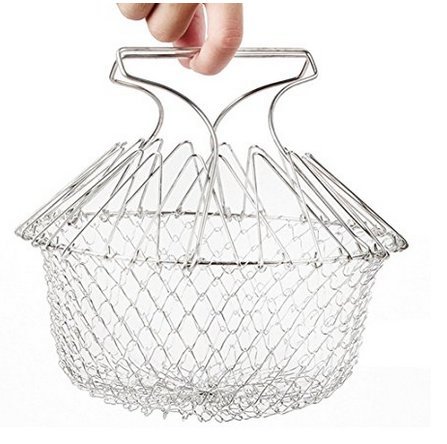 This stainless steel net is a nice well made frying tool or fruit basket. Its folds away really well for easy storage its washes easy to and cleans up just like new again, it hold a bag of chips and holds them all securely, makes cooking alot easier