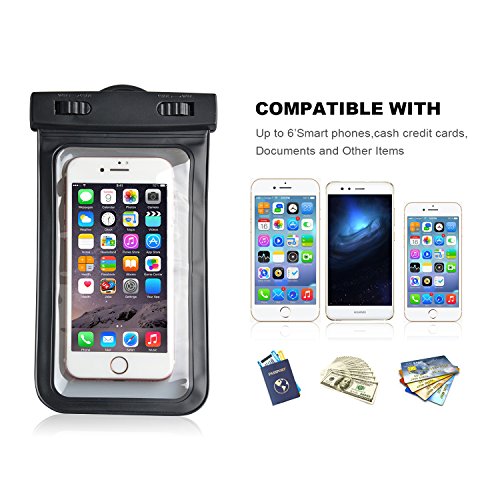 IPX8 Waterproof - IPX8 Certified to 100 feet (30 meters), fully submersible and waterproof, protect your phones from Water, Sand, Dust and Dirt. Double-side Ultra-transparent and Touch Screen - Transparent ultra thin window on both sides, allow fully sensitive screen touch for taking pictures and video underwater at ease. Widely Use - Ideal for beach, bath tub, fishing, swimming, boating, kayaking, snorkeling, skiing and water park activities. No need to worry about your phone anymore while outdoor sports. Universality - Compatible with iPhone 7/ 7Plus/ 6/ 6S/ SE/ 6 Plus/ 6S Plus / 5/ 5S/ SE, Huawei p8, p9, Samsung Galaxy S7, S7 Edge, S6, S6 Edge, S5, Note 4 and Other Smartphones up to 6.0 inch. Durable and Eco-friendly - Made from ABS plastic material for extreme conditions, it's eco-friendly, aging-resistant;shock resistance,wear-resisting and Touch sensitive. Package Included: 1 x Black Armband Case 1 x Blue Case