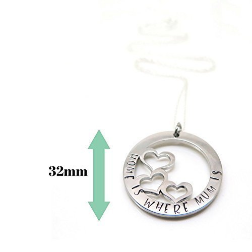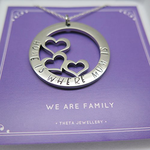 Make Mum cry happy tears! Let her know the 3 things you love most about her. Only 3 things? You have lots of things in your heart to say to her, but you don't always take the time to say it. Make it easy on yourself with this gorgeous necklace and card to add the 3 things you love most about Mum. Trust me, this gift will be unforgettable.MOTHER NECKLACE * Circle pendant with 3 hearts * Hand stamped with "Home is Where Mum is'* Includes a card with the wording 'We are Family' on the front and on the back, there is room to add the 3 things you love most about Mum* Presented in a gift box Presented on an 18 inch (45cm) sterling silver chain DIMENSIONS AND MATERIALS * Stainless steel pendant size: 1.25 inches (32mm) in diameter HAND STAMPING As all text is lovingly hand stamped it means it's quirky and wonderful, so if you are after the symmetry & perfection of an engraving machine, this isn't for you (but you'd probably like this more!).Thanks for supporting handmade and for visiting my corner of the internet. Please message me with any questions you may have. Julie - Edinburgh