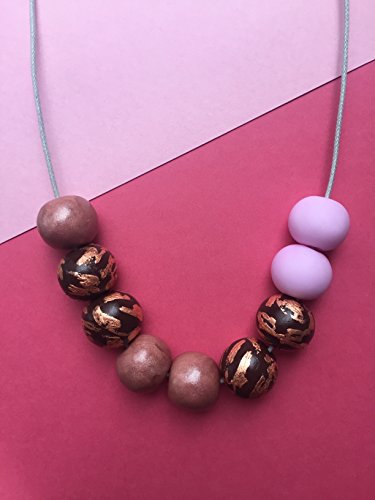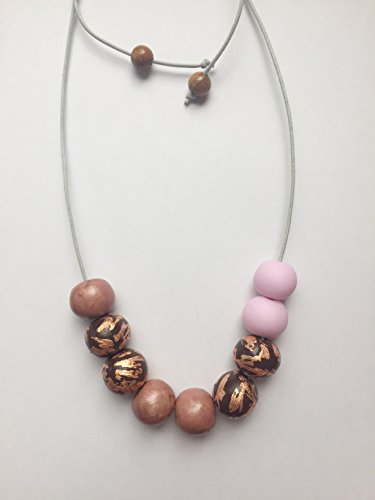 This statement necklace is made from hand-rolled polymer clay beads and strung on grey waxed cotton cord. The necklace is made using pale pink, rose gold and brown & gold foil beads. It features a sliding knot design, so it can be adjusted from 42cm (roughly 16.5in) right up to choker fit. The adjustable feature means this stand-out piece will look great with all necklines. The knot is finished with 2 wood beads. ~ adjustable necklace ~ maximum hanging length of 42cm ~ all beads hand-rolled in my studio in Dundee ~ each necklace is made by hand, so no 2 pieces are identical ~ 9 clay beads with a diameter of roughly 2cm each