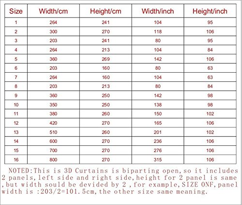 FeatureThese curtains will help transform your room into your private sanctuary! Perfect for any room including living rooms, bedrooms, kids and dorm rooms. Matches well with various color palettes of rugs,furniture and any other home decor accessories.Made from high quality 100% polyester tight woven, China Made, Silky Satin Fabric. Environmentally friendly, no dye substance harming health of your family.With vibrant colors and clear images these curtains add a great perspective and completely change the look of your room. High resolution pictures bring 3D like realistic experience to your life. It is not too thin or too thick. Quick and luxurious way to refresh and completely change the appearance of your home without a big expense.Digital Printing Curtains Finished = Curtains + Accessories Hook + Premium Roman Rings (excluding curtain rods or rails)Curtain features: UV + noise reduction + 100% shading + green printing + export to Europe and the United States standards.Curtains Uses: School - Living Room - Bedroom - Kitchen - Office - Hotel - Villa.Curtain maintenance: Machine wash at room temperature - Hand wash lightly - Dry clean - Warm iron - Do not bleach - Do not shuffle with sharp objects.Installation Usage: 1. The user who installs the chute needs to use the S single hook that we are equipped with to hang 2. The customer who installs the Roman rod needs to wear the Roman ring donned on the pole and then use the S single hook to hang it. Notice ;The digital images we display have the most accurate color possible, however due to differences in computer monitors, we cannot be responsible for variations in color between the actual product and your screen. No hardware is included.