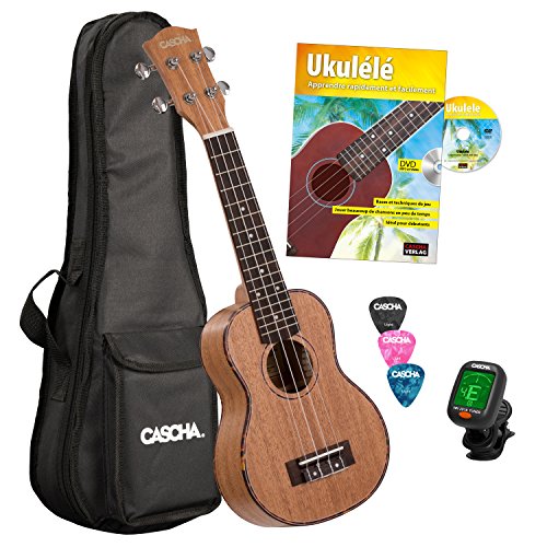 CASCHA HH 2027 FR Premium Mahogany Soprano Ukulele Bundle with AQUILA strings, French ukulele method with DVD, padded bag and 3 picks
