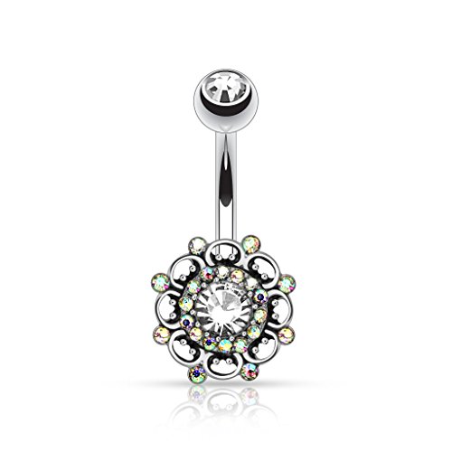 1 piece - 1.6 mm diameter x 10 mm length. Stainless steel navel piercing; Shield motif rhodium-coated brass pendant; Set with Zirconia / crystal; Top ball with screw fastening. Sign: 12 mm high x 12 mm wide; Ball diameter: 5 mm / 1/5 inches; Cubic Zirconia diameter: 4 mm / 3 mm, Zirconia colour: Clear, crystal diameter: 1 mm; Crystal colour: Polar light.