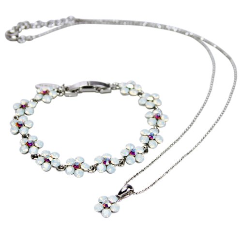 Five white opal and one AB Swarovski crystals make each flower to create these very pretty necklace and bracelet. 12 flowers make up this bracelet on Nickel free metal and Rhodium Plated. With two secure closed fastening create two lengths of 180 mm and 170 mm. The crystal flower pendent necklace is 11mm in diameter and 19mm in height. The Rhodium plated ball necklace chain length is 390mm with a lobster clasp and chain fastening giving wearing lengths of 395mm to 445mm. Each flower is approximately 10 mm in width and stands proud by 5mm. UK dispatch and 4 weeks to return. All measurements are approximated.